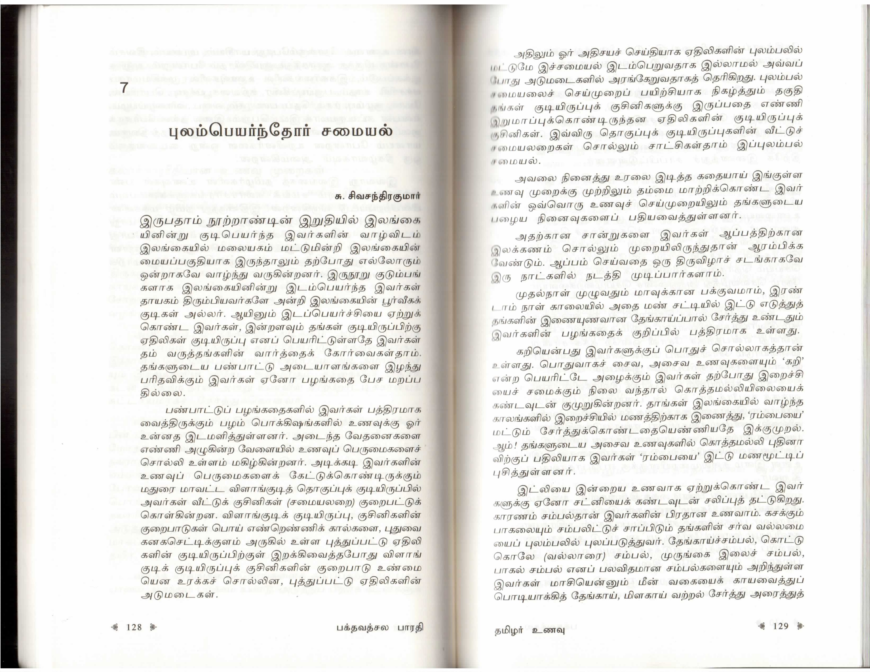 இது போன்ற விடயங்களை “பண்பாட்டு மானிடவியலாளரான” பக்தவத்சல பாரதி தொகுத்த இந்தப் புத்தகத்தில் காணலாம் என்ற ஆர்வமே புத்தகத்தை வாசிக்கத் தூண்டியது. காலையிலும் மாலையிலுமாக வீடு –> வேலை, வேலை — > வீடு வரையான பயண நேரங்களில் வாசிக்கவும் அதிகம் ஆழமான் வாசிப்புத் தேவைபப்டாத புத்தகமாக அதனைத் தேர்ந்து வாசிகக்த் தொடங்கினேன். என் போதாத காலம், புத்தகம் நான் எதிர்பார்த்த விதத்தில் இருக்காததுடன் (நான் எதிர்பார்த்தது போல புத்தகம் இருக்க வேண்டும் என்பதோ அப்படி இருக்காதது பெருங்குற்றம் என்றோ இதை விளங்கிக் கொள்ளவேண்டாம்) மிகுந்த வெறுப்புணர்வுடனும் குரூரமான கேலியுடனும் எழுதப்பட்ட மோசமான கட்டுரை ஒன்றை வாசித்துத் தொலைக்கவேண்டியும் ஏற்பட்டுவிட்டது. கட்டுரையின் தலைப்பு புலம்பெயர்ந்தோர் சமையல். நாம் பெற்ற இன்பம் பெறுக என்று கட்டுரையை கீழே இணைத்துள்ளேன். அண்மைக்காலமாக கருத்துச் சுதந்திரம், ஊடக சுதந்திரம் என்று கூறிக்கொண்டு காலச்சுவடிற்கு வக்காலத்து வாங்குவோர் இது போன்ற காலச்சுவடின் குரூரமான முகத்தினையும் கண்டுணர வேண்டும் என்பது என் வேண்டுகோள்.