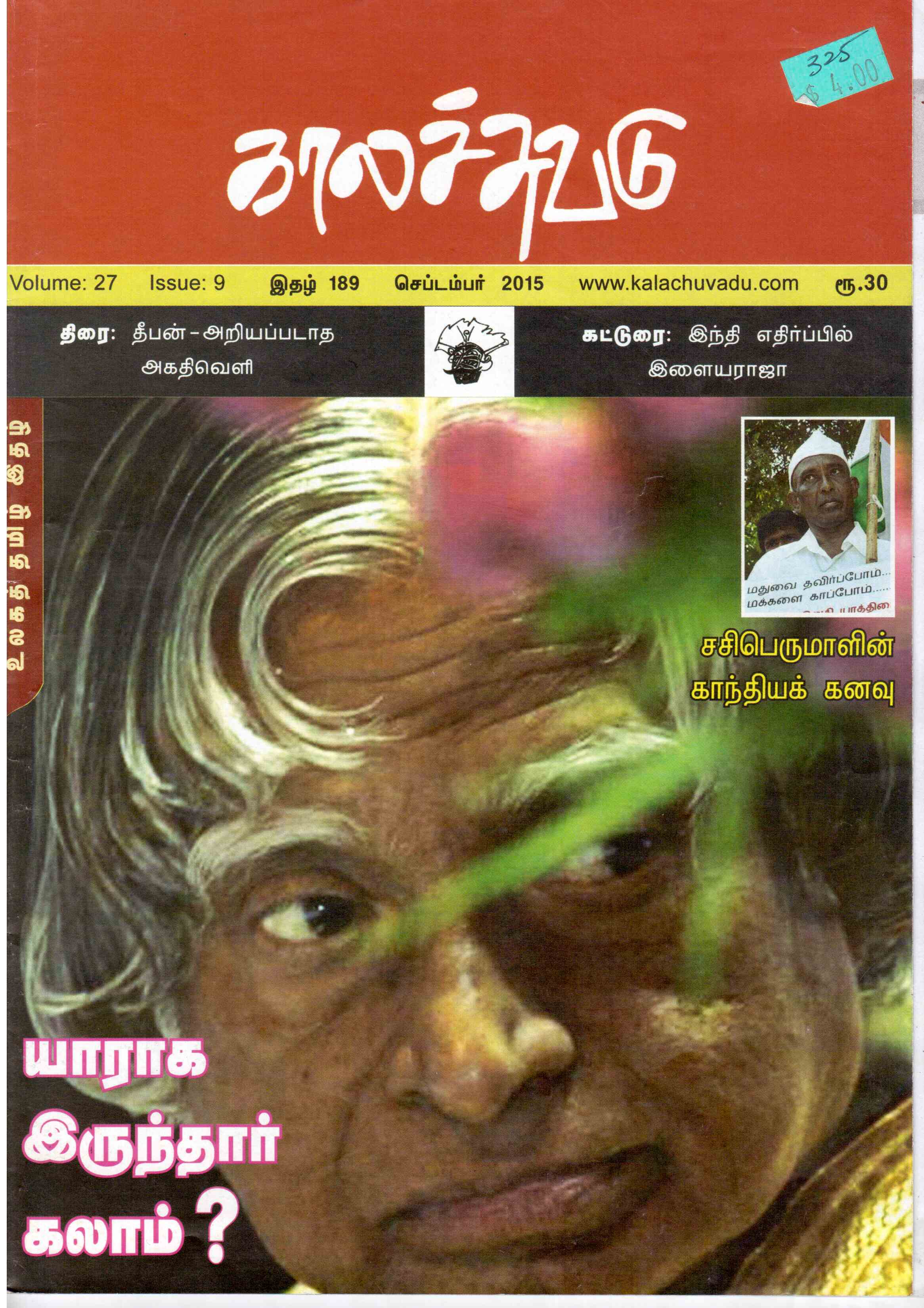 மாறாக, பாமினி பற்றி அலுத்துக்கொள்ளும் கண்ணனி காலச்சுவடு இதழ்களில்தான் இங்கே ரஞ்சகுமார் வைக்கின்ற குற்றச்சாட்டு நிகழுகின்றது. செப்ரம்பர் மாத காலச்சுவடையே எடுத்து நோக்குவோம். அதன் அட்டையில் “யாராக இருந்தார் கலாம்?”, “இந்தி எதிர்ப்பில் இளையராஜா” என்கிற இரண்டு கட்டுரைகளிலும் அரவுக்கு மேல் புள்ளியிடும் முறையே இருக்கின்றது. அது மட்டுமல்ல, செப்ரம்பர் மாத தீராநதி இதழை எடுத்துப் பார்த்தாலும் கூட, அதன் அட்டையிலேயே “நேர்காணல், நேர்கண்டவர், சிவகுமார், ஈழத்தமிழர், எதிர்ப்பும்” ஏகிய சொல்களில் அரவின் மேல் புள்ளியிடும் வழமையே தொடர்கின்றது. அதாவது ரஞ்சகுமார் “சொல்கின்ற எந்தவொரு பாடநூல் ஆசிரியரோ, பாடவிதான சபையோ இதை அங்கீகரிக்கப்போவதில்லை” என்பது மேலே குறிப்பிட்ட தமிழக இதழ்கள் பயன்படுத்துகின்ற எழுத்துருக்களுக்கே சாலப் பொருந்தும். அந்த அடிப்படையில் அவற்றுக்கான சரியான தீர்வு பாமினி என்பதை தர்க்கரீதியாக நேரடியாக விளங்கிக்கொள்ளலாம். மேலதிக விளக்கத்திற்காக இந்த இரண்டு இதழ்களின் அட்டைப்படத்தையும் இத்துடன் இணைத்துள்ளேன்: