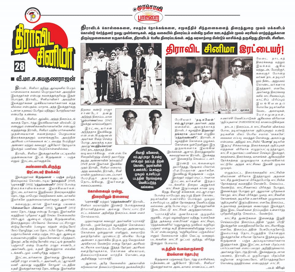 அண்மையில், தியடோர் பாஸ்கரன் எழுதிய எம் தமிழர் செய்த படம் நூலினை வாசித்தேன், அதில் இறுதியாக இடம்பெற்றுள்ள நேர்காணலில் திராவிட இயத்தினர் திரைத்துறையினை எவ்விதம் பயன்படுத்திகொண்டனர் என்கிற கேள்விக்கான பதில், திராவிட இயக்கத்தினர் திரைத்துறையில் ஏற்படுத்திய தாக்கத்தினை மிகவும் மேலோட்டமானதாக மதிப்பீடு செய்வதாக இருக்கின்றது. திராவிட இயக்கத்தினரால் பொதுவான சீர்திருத்தக் கருத்துகளை மட்டுமே திரைப்பட ங்களில் வெளிப்படுத்தக் கூடியதாக இருந்தது என்று கூறுவதுடன், அதற்கான காரணங்களாக திராவிட இயக்கத்தினர் வசனகர்த்தாக்களாகவே இருந்தார்கள், இயக்குனர்கள் வேறு ஒருவராக இருந்தமையையும் குறிப்பிடுகின்றார்.