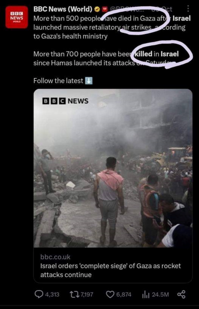 காசாவில் 500 பேர் “இறந்தார்கள் (Died)”; இஸ்ரேலில் 700 பேர் “கொல்லப்பட்டார்கள் (Killed)”