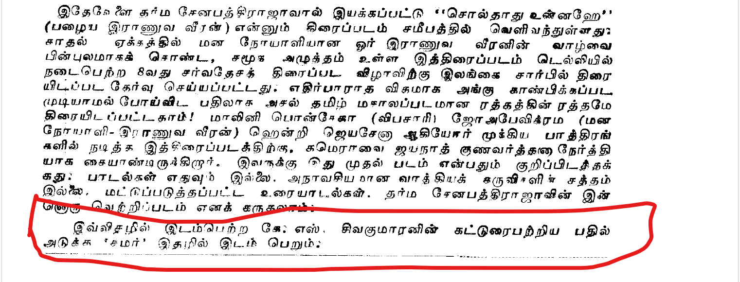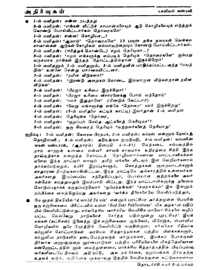 இந்தக் கவலையீனத்தால் நடந்த பெரும் அபத்தம் என்னவென்றால், Tamil Literary Scene – Marxists VS Formalists என்ற தலைப்பில் செப்ரம்பர் 15 1980 இல் வெளியான Lanka Guardian இதழில் சமுத்திரன் எழுதிய கட்டுரைக்கான எதிர்வினையாக கே எஸ் சிவகுமாரன் சமர் 7 இல் எழுதிய கலையும் விவாதங்களும் என்கிற கட்டுரையில் கே.எஸ். சிவகுமாரன் எழுதியவற்றையெல்லாம் டானியல் அன்ரனியின் தலையில் சுமத்தி கேலிக்கூத்தாகவே நடந்துமுடிந்திருக்கின்றது. (இந்த லங்கா கார்டியன் மலர் 3, இதழ் 9 ஆகும், தவறுதலாக இது மலர் 8, இதழ் 9 என்று இந்த தொகுப்பில் பதிவாகியுள்ளது). உதாரணமாக இந்தக் கட்டுரையில் கே.எஸ் “கால மாற்றத்தில் மார்கியமே வெவ்வேறு அர்த்தங்களைக் கொண்டுவரும்போது 1930களில் நிலவிய மார்க்சிய இலக்கியக் கொள்கை இன்று அர்த்தமுடையதாக இருக்குமோ? என்ற கேள்வியைக் கேட்கின்றார். இதனை டானியல் அன்ரனி எழுதியதாக நினைத்துக்கொண்டு “கால மாற்றத்தில் மார்கியமே வெவ்வேறு அர்த்தங்களைக் கொண்டுவரும்போது 1930களில் நிலவிய மார்க்சிய இலக்கியக் கொள்கை இன்று அர்த்தமுடையதாக இருக்குமோ? எனத் துணிச்சலுடன் கேள்வியைக்கேட்டவர் அவர் என்று டானியல் அன்ரனியை இந்த நூலுக்கு முன்னுரை எழுதிய ஷோபா சக்தி சுட்டுகின்றார். அது மட்டுமல்லாமால் இதே முன்னுரையில் ஷோபா, டானியல் அன்ரனி எழுதியதாக மேற்கோள் காட்டும் “வெறும் அரசியலுக்காகக் கலை இலக்கியங்களைப் பயன்படுத்த முற்படும்பொழுது கலை இலக்கியங்கள் வெறும் அரசியலாகவே மாறிவிடுகின்றன… அரசியல் மாத்திரம் மிஞ்சி நிற்கும்பொழுது கடப் பாட்டு (கொமிட்டட்) வக்கிரமாகவே நின்றுவிடுகிறது” என்பது கூட இதே “கலையும் விவாதங்களும்” கட்டுரையில் கே.எஸ். சிவகுமாரன் எழுதியிருப்பதுதான். ஆகக் குறிப்பாக, இந்தத் தொகுப்பிற்கான முன்னுரையில் டானியல் அன்ரனியின் எழுத்துகள் என்று இரண்டு மேற்கோள்களைச் சுட்டிக்காட்டி டானியல் அன்ரனியின் காலத்தைய இட து சாரிகளின் கலை இலக்கியக் கொள்கைகளைக் கேள்வி கேட்டு டானியல் அன்ரனி எழுதியவை என்று ஷோபா சக்தி சுட்டிக்காட்டுகின்றார். ஆனால் அவற்றை எழுதியவரோ கே.எஸ். சிவகுமாரன். மார்க்சிய கலை இலக்கியக் கோட்பாட்டை அடிக்க கிடைத்த ஆயுதம் என்ற பரவசத்தில் ஷோபா சக்தி, டானியல் அன்ரனி இதே இதழில் அதிர்வுகள் 7 பத்தியின் கடைசி வசனமாக எழுதியுள்ள “இவ்விதழில் இடம்பெற்ற கே.எஸ். சிவகுமாரனின் கட்டுரை பற்றிய பதில் அடுத்த சமர் இதழில் இடம்பெறும்” என்ற வசனத்தை அப்படியே கைவிட்டுவிட்டார் (படம் 2).